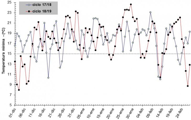 El promedio de la temperatura mínima en el trimestre diciembre – enero – febrero fue el mismo para ambos ciclos productivos y se ubicó en 17,7 ºC.