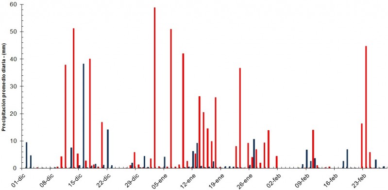La precipitación acumulada desde diciembre a febrero en el ciclo 2018/19 fue de 610 mm, es decir que experimentó un incremento del 53 % con respecto al valor esperado (la precipitación acumulada esperada se sitúa alrededor de 400 mm).