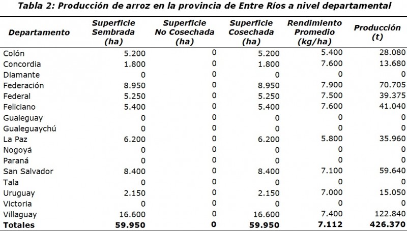 Los datos estadísticos sobre la superficie implantada con arroz a nivel departamental se presentan en la Tabla 2.