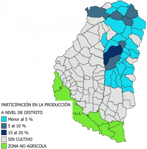 El distrito con mayor producción fue Lucas Sur (Dpto. Villaguay) con una participación sobre la producción total que se ubicó dentro del rango de 15 al 20 % (Figura 5).