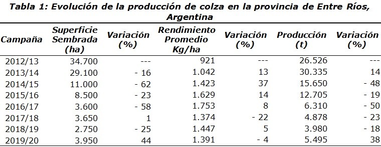 En la Tabla 1 se detalla la evolución de la producción de colza en la provincia de Entre Ríos.