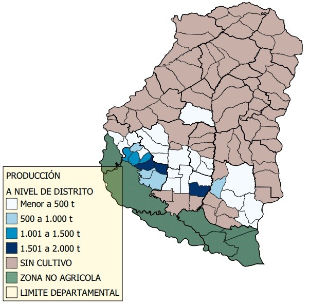 En la Figura 1 se muestra la distribución espacial de la producción de colza a nivel de distrito, la cual se resume del siguiente modo: