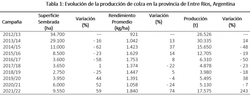 La Bolsa de Cereales de Entre Ríos da a conocer el informe correspondiente a la producción de colza en el ciclo 2021/22 en la provincia de Entre Ríos, Argentina.