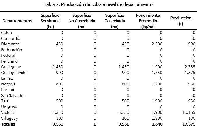 El principal departamento productor de colza fue Victoria, ya que concentró el 56 % del área implantada y el 58 % del total de las toneladas de la provincia.