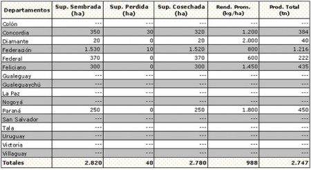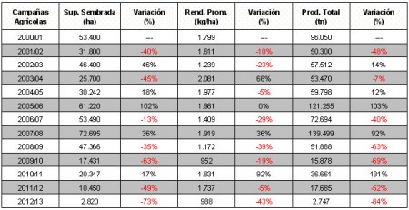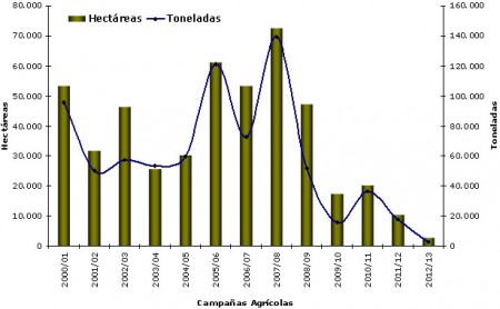 Claramente puede apreciarse como a partir de la campaña 2007/08 el área implantada y la producción disminuyó abruptamente, pasando de 72.695 ha y 139.499 tn a la mínima expresión con 2.820 ha y 2.747 tn, ver Gráfico 1.