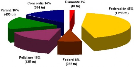 Tan solo en 6 departamentos se detectó la siembra de girasol, correspondiéndole la mayor producción al departamento Federación con 1.216 toneladas que representa el 45% del total, ver Gráfico 2.