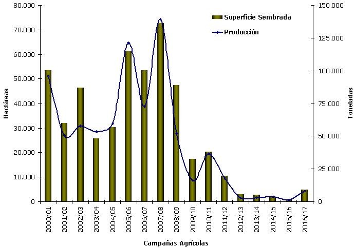 La producción de girasol totalizó 7.165 toneladas (t), cifra que refleja un crecimiento de 6.025 t (528 %) en relación a la campaña 2015/16 que tan solo alcanzó a 1.140 tn.