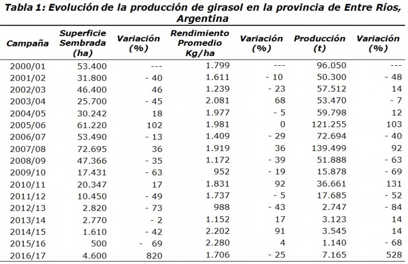 En la tabla N° 1 se detalla la evolución de la producción de girasol en Entre Ríos desde el ciclo agrícola 2000/01.
