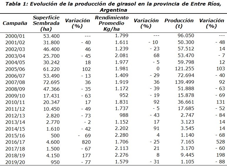 En la Tabla 1 se detalla la evolución de la producción de girasol en la provincia de Entre Ríos.