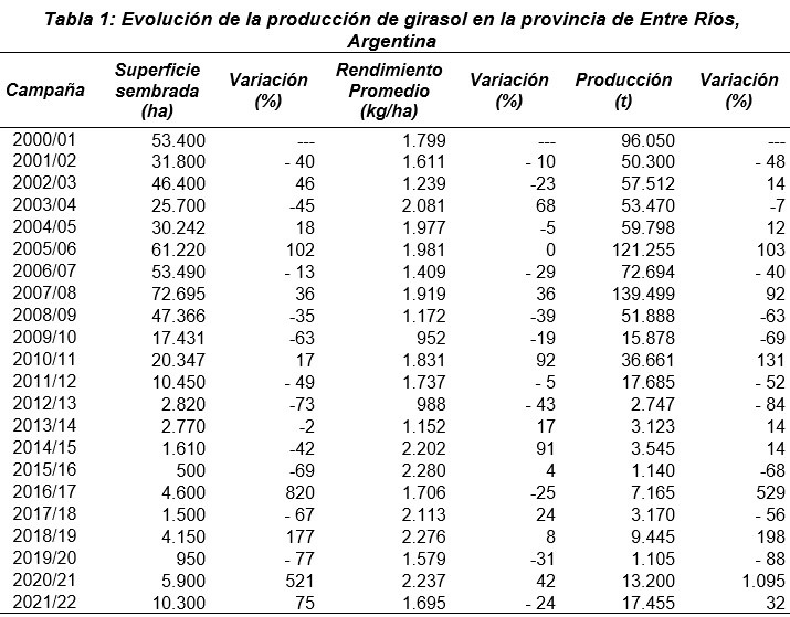 Los datos estadísticos sobre la evolución de área implantada y producción con girasol en Entre Ríos se presentan en la Tabla 1.