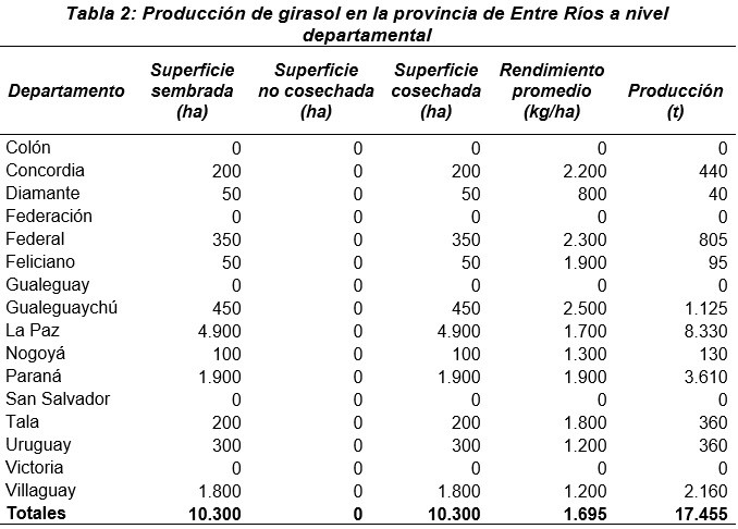 Los datos estadísticos sobre la superficie implantada con girasol a nivel departamental se presentan en la Tabla 2.
