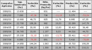 Como puede observarse en el cuadro siguiente, la presente campaña fue superadora manifestando las cifras de Área Sembrada, Rendimiento y Producción más altas del último decenio, con incrementos de 156,23%; 22,30% y 210,21% respectivamente.