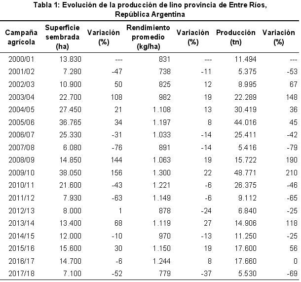 En la Tabla 1 se detalla la evolución de la producción de lino en la provincia de Entre Ríos.