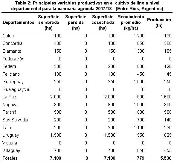 En la Tabla 2 se detallan las principales variables productivas del cultivo de lino a nivel departamental.