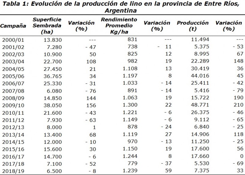 En la Tabla 1 se detalla la evolución de la producción de lino en la provincia de Entre Ríos.