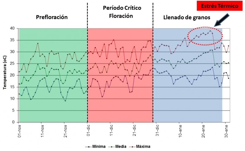 Finalmente no se puede pasar por alto lo acontecido entre el 15 al 24 de enero, donde hubo temperaturas máximas que superaron la marca de 35 ºC, hecho que generó un fuerte estrés térmico en el cereal que se encontraba en plena etapa de llenado de granos. (ver Grafico N°3).