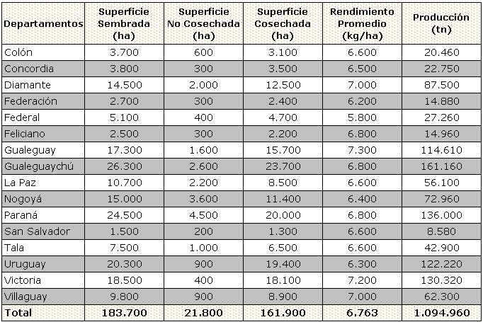 Los máximos rendimientos se detectaron en Gualeguay, Victoria, Diamante y Villaguay con valores de 7.300 kg/ha, 7.200 kg/ha y 7.000 Kg/ha, respectivamente.