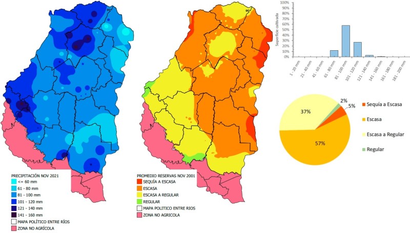 La precipitación promedio del mes de noviembre en la provincia de Entre Ríos es de 124 mm, en base al promedio del periodo 2004 – 2020 (BCER).
