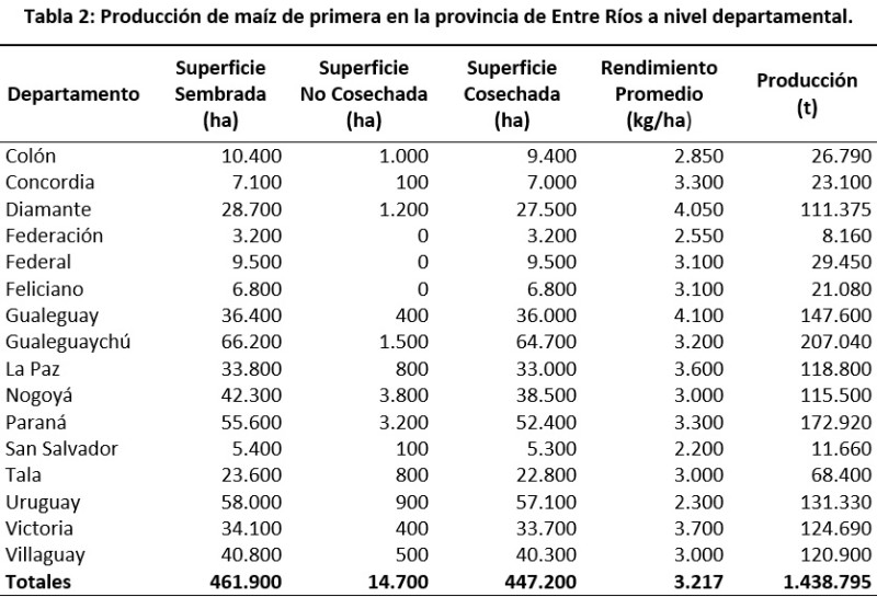 Los datos estadísticos sobre la superficie implantada con maíz de primera a nivel departamental se presentan en la Tabla 2.
