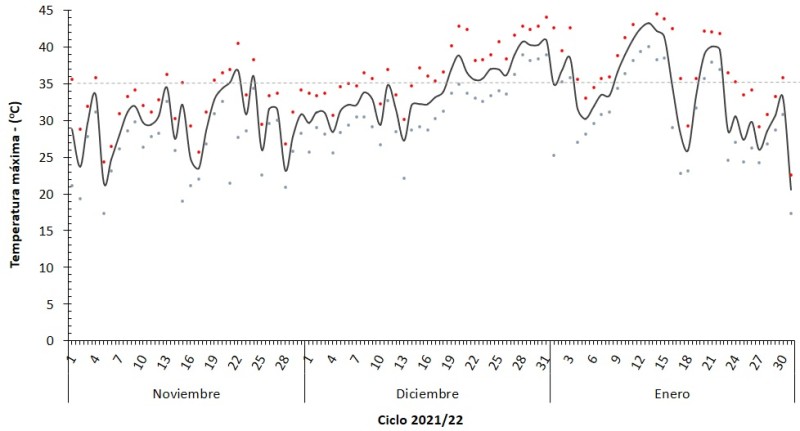 Es importante destacar la cantidad de días donde el promedio de la marca térmica en la red superó los 35 oC, lo cual se puede asociar a un escenario de estrés. El día más caluroso del trimestre fue el 12/01/2022 con una media de 43,3 oC.