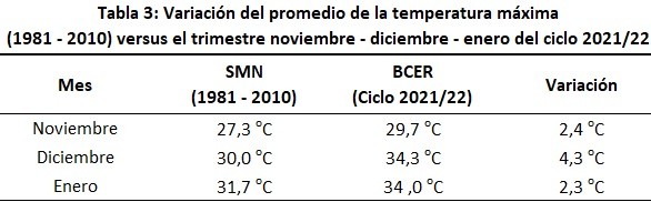 El promedio de la temperatura máxima para este trimestre, en base a datos publicados por el Servicio Meteorológico Nacional (SMN) en el periodo 1981 – 2010, se ubica en 29,7 oC. Cabe destacar que, en el ciclo 2021/22 el promedio fue de 32,7 oC, lo cual representó un incremento en la temperatura máxima de 3 oC.