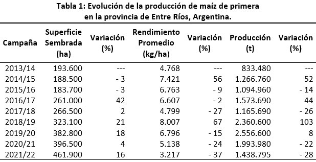 Los datos estadísticos sobre la evolución del área implantada con maíz de primera en Entre Ríos se presentan en la Tabla 1.