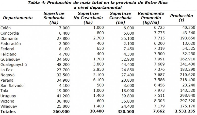 PRODUCCIÓN DE MAÍZ DE TOTAL EN LA PROVINCIA DE ENTRE RÍOS A NIVEL DEPARTAMENTAL