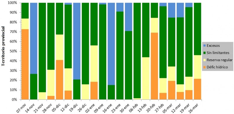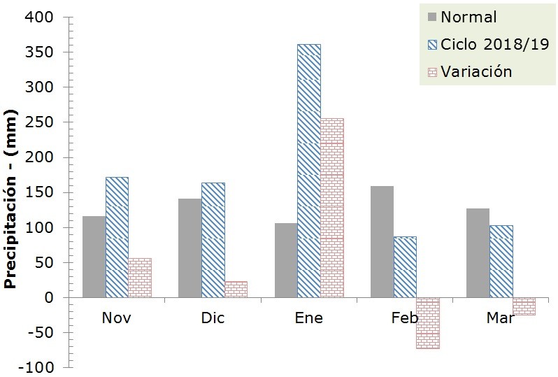 La precipitación acumulada desde el 01/Nov/18 al 31/Mar/19 fue superior a lo esperado, no obstante, se registraron pequeños déficits hídricos. La Figura 2 resume la evolución de las reservas hídricas a escala semanal.