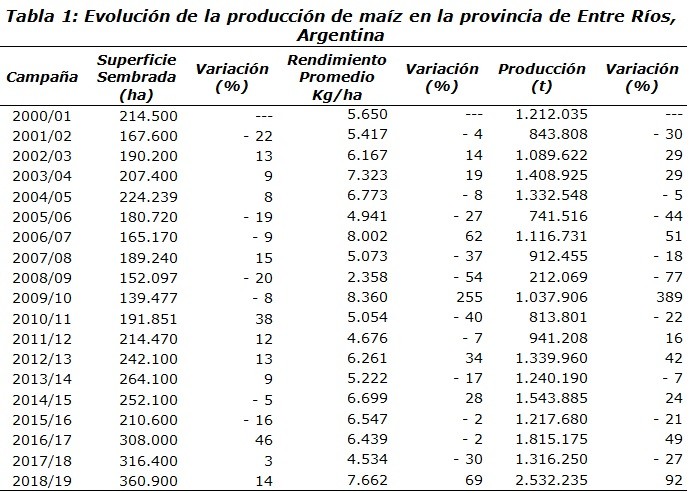 En la Tabla 1 se detalla la evolución de la producción de maíz en la provincia de Entre Ríos.