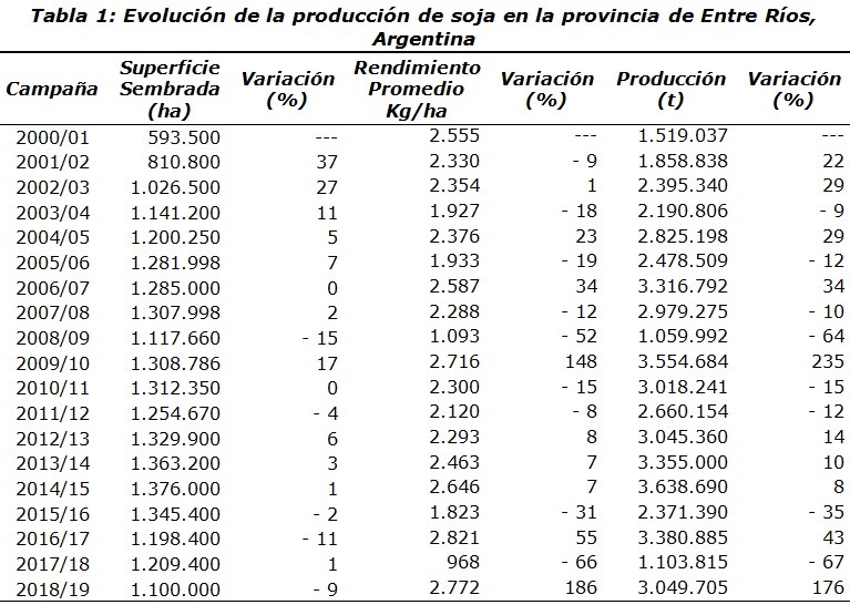 En la Tabla 1 se detalla la evolución de la producción de soja en la provincia de Entre Ríos.