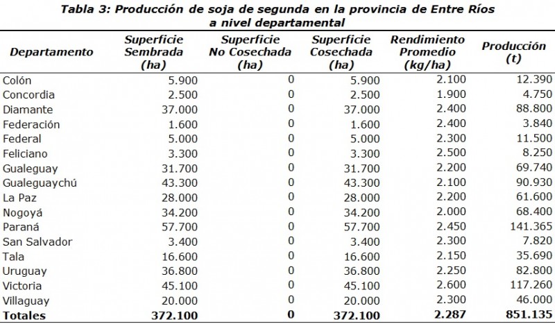 PRODUCCIÓN DE SOJA DE SEGUNDA EN LA PROVINCIA DE ENTRE RÍOS A NIVEL DEPARTAMENTAL
