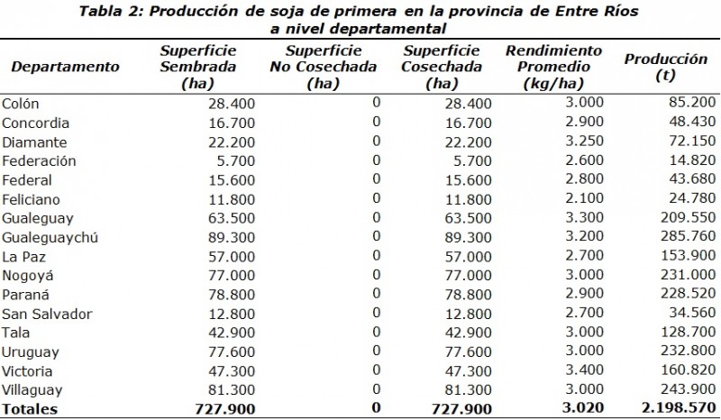Los datos estadísticos sobre las principales variables que definen la producción de la soja de primera a nivel departamental se presentan en la Tabla 2.