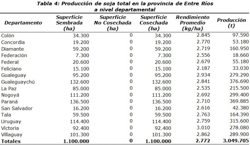 Los datos estadísticos sobre las principales variables que definen la producción de la soja a nivel departamental se presentan en la Tabla 4.