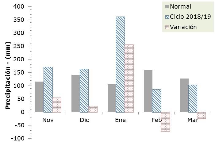 El promedio acumulado esperado para Entre Ríos entre noviembre y marzo se ubica en 650 mm. El ciclo 2018/19 tuvo un promedio acumulado de 888 mm, esto representó un incremento del 37 % (238 mm).