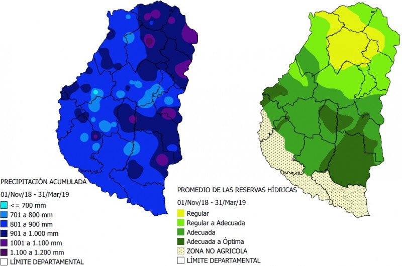 En la Figura 2 se muestra la distribución de la precipitación acumulada y el promedio de las reservas hídricas del 01/Nov/18 al 31/Mar/19.