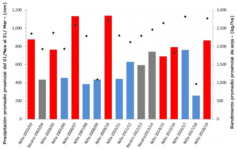 El promedio de precipitación de los años Niño se ubica en 900 mm y el rendimiento promedio provincial de soja en 2.470 kg/ha.