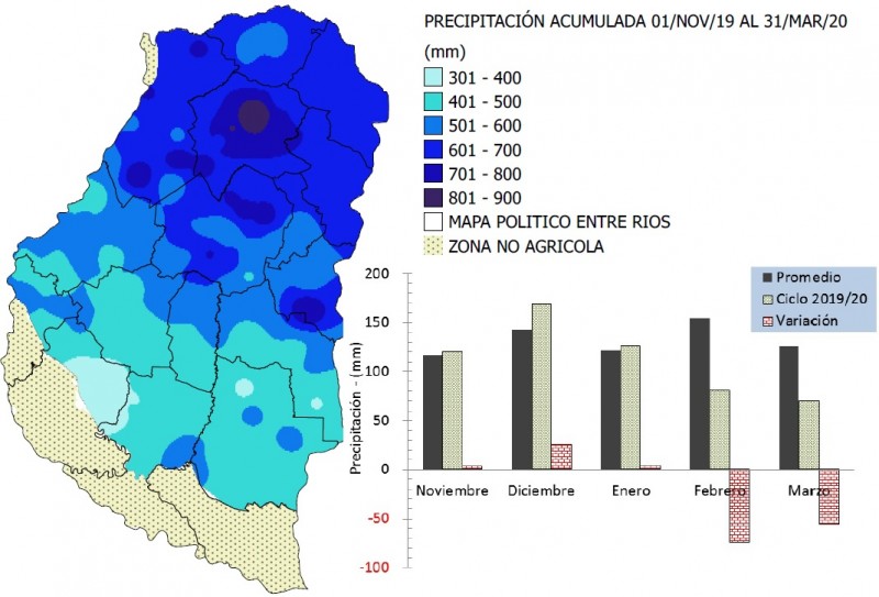 La precipitación promedio acumulada en el periodo noviembre – marzo para el ciclo 2019/20 en Entre Ríos fue de 565 mm, lo cual representó una disminución del 15 % (97 mm) en relación al promedio de los últimos 16 años.