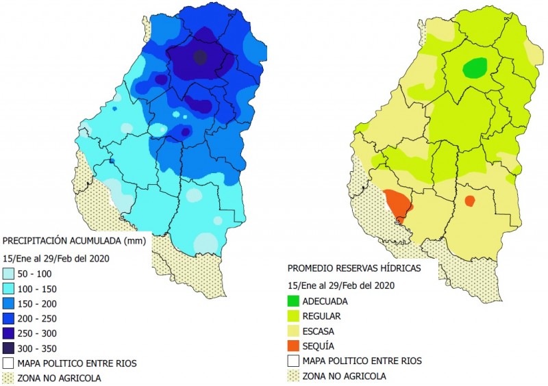 En relación a las reservas hídricas se destaca un escenario de sequía en el Suroeste del departamento Victoria y una pequeña área del Norte del departamento Gualeguaychú.