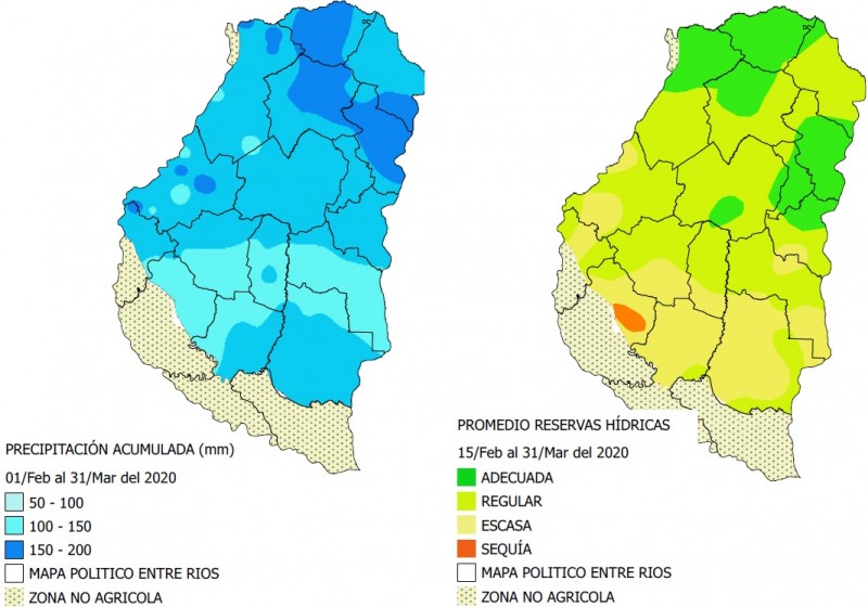 En la Figura 3 se muestra la distribución de la precipitación acumulada y la situación promedio de las reservas hídricas en la provincia de Entre Ríos del 01/Feb al 31/Mar del 2020, momento en el cual se ubicó aproximadamente el periodo crítico de la soja de segunda.