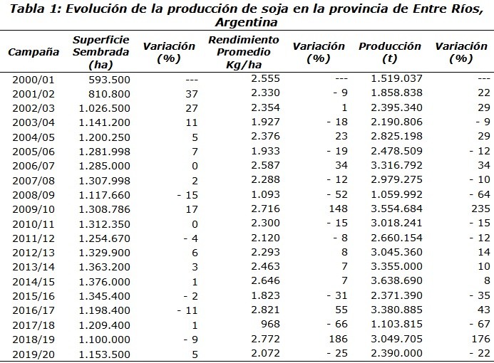 En la Tabla 1 se detalla la evolución de la producción de soja en la provincia de Entre Ríos.