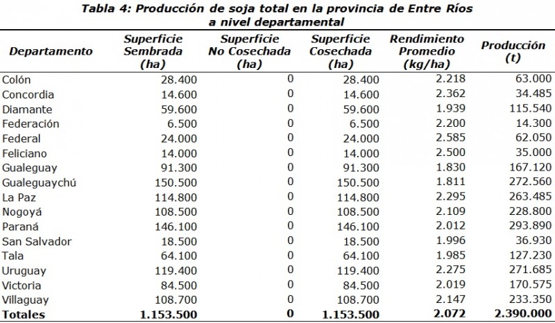 Los datos estadísticos sobre las principales variables que definen la producción de la soja a nivel departamental se presentan en la Tabla 4.