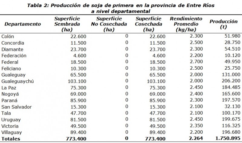 La soja de primera abarcó el 67% de la superficie y el 73 % de la producción total. Se destacó el departamento Gualeguaychú con una participación del 13 % en el área sembrada y aportó el 12 % de la producción.