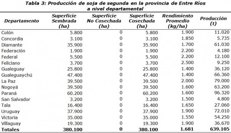 PRODUCCIÓN DE SOJA DE SEGUNDA EN LA PROVINCIA DE ENTRE RÍOS A NIVEL DEPARTAMENTAL
