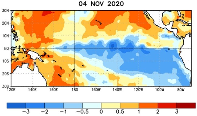 A inicios de noviembre, el Océano Pacífico Ecuatorial se encontraba con temperaturas más frías que lo normal y los pronósticos meteorológicos confirmaban la presencia de “La Niña” (Figura 1).