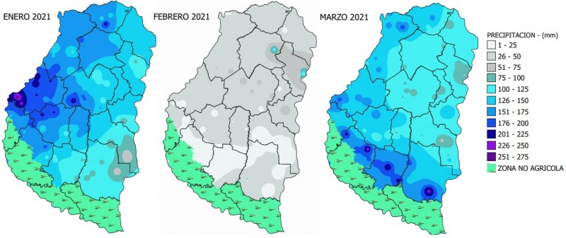 En la Figura 3 se muestra la distribución de la precipitación acumulada en los meses de enero, febrero y marzo del 2021 en la provincia de Entre Ríos.