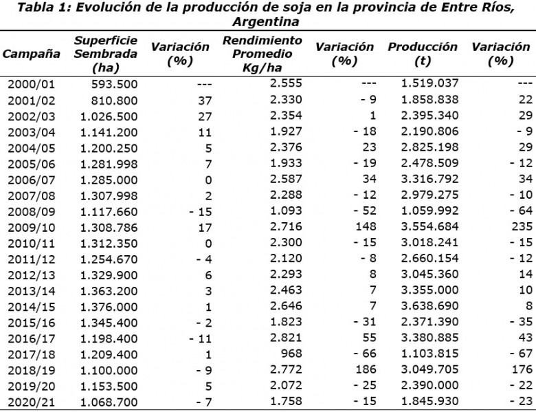 En la Tabla 1 se detalla la evolución de la producción de soja en la provincia de Entre Ríos.