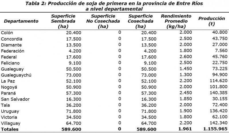 Los datos estadísticos sobre las principales variables que definen la producción de la soja de primera a nivel departamental se presentan en la Tabla 2.