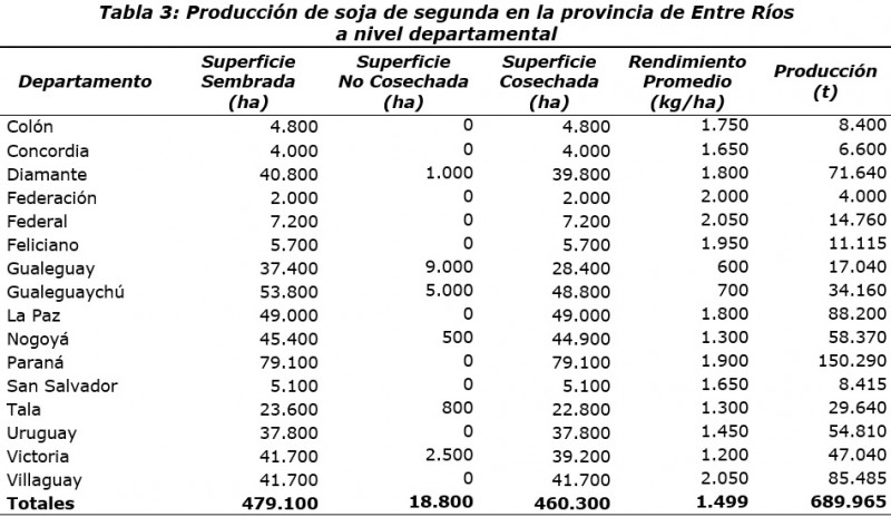 PRODUCCIÓN DE SOJA DE SEGUNDA EN LA PROVINCIA DE ENTRE RÍOS A NIVEL DEPARTAMENTAL