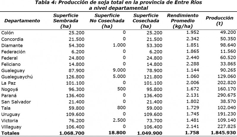 Los datos estadísticos sobre las principales variables que definen la producción de la soja a nivel departamental se presentan en la Tabla 4.