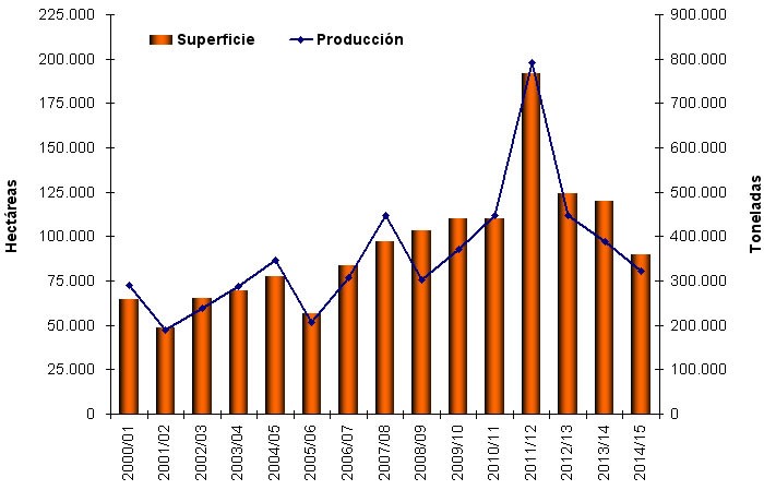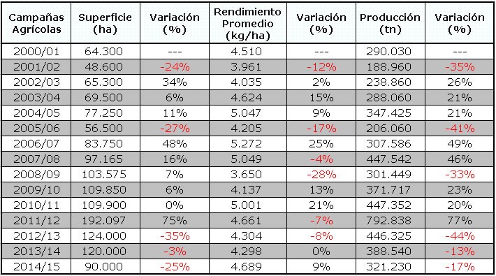 La producción de sorgo en el ciclo agrícola 2014/15 tuvo una tendencia negativa, ya que experimentó una caída del 25% en el área y una merma del 17% en la producción alcanzada.